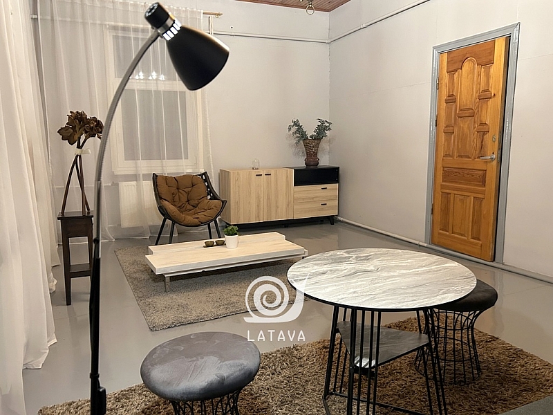 Butas su baldais ir buitine technika (šaldytuvas, el. viryklė, skalbyklė).